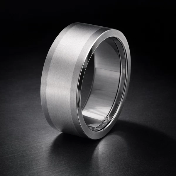 Szeroka obrączka z tytanu i białego złota 14k łączy nowoczesny materiał z klasycznym akcentem. Matowe wykończenie i wyraźna linia podziału nadają jej spokojny, uporządkowany charakter.