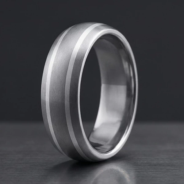 W tym modelu prostą bryłę przełamują dwa srebrne paski poprowadzone przy bocznych krawędziach. Taki detal porządkuje całość wizualnie i dodaje delikatnego kontrastu między chłodnym matem tytanu a jaśniejszym połyskiem srebra 925. Półokrągły profil oraz wysokość 3 mm sprawiają, że obrączka wygląda solidnie, ale nie ciężko. Na szerszych dłoniach prezentuje się proporcjonalnie i spokojnie, a na smuklejszych staje się bardziej zauważalnym akcentem.