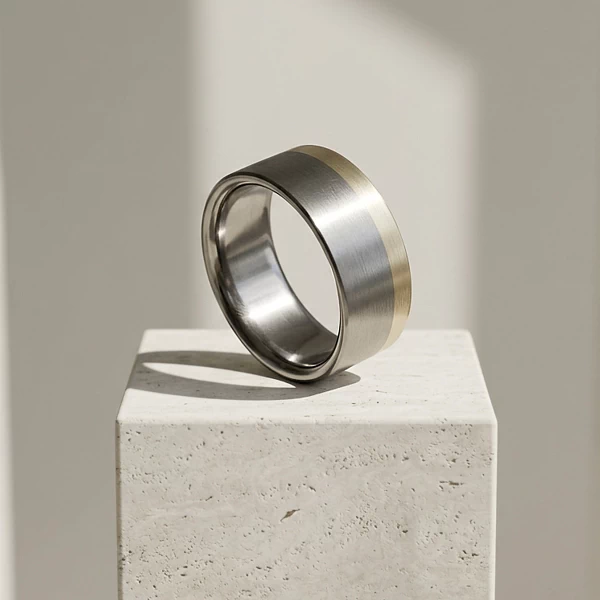 Złoty element został trwale osadzony w tytanowej bazie. Ręczne wykonanie widać w starannie wykończonych krawędziach i równym przejściu między metalami. Każda sztuka może różnić się subtelnymi detalami, co jest naturalne przy pracy manualnej. Taki model dobrze sprawdzi się także wtedy, gdy jedna osoba wybiera klasyczne złoto, a druga preferuje tytan – wizualnie łączy oba światy w jednej formie.