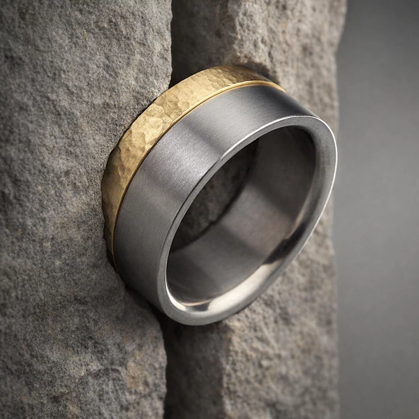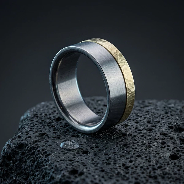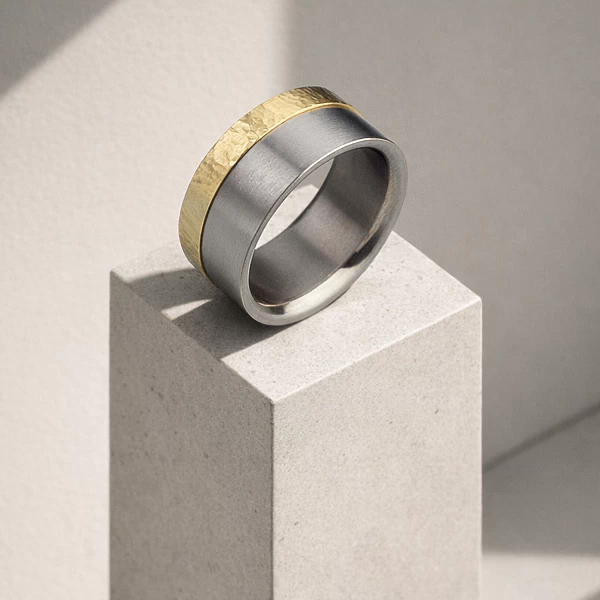 Konstrukcja opiera się na płaskim profilu, co nadaje całości geometryczny, współczesny wygląd. Główną część powierzchni stanowi matowy tytan w odcieniu głębokiej szarości, który odpowiada za surowy odbiór projektu. Przełamaniem tej prostoty jest asymetryczny pasek z 14-karatowego złota umieszczony na krawędzi. Złoty element został poddany ręcznemu młotkowaniu, dzięki czemu jego nieregularna faktura subtelnie pracuje ze światłem, kontrastując ze spokojną, gładką powierzchnią tytanowej bazy. Taka szerokość obrączki sprawia, że jest ona bardzo widocznym elementem stylizacji, a jej proporcje wymagają świadomego wyboru – najlepiej prezentuje się na nieco większych dłoniach, gdzie zachowuje odpowiedni balans wizualny.