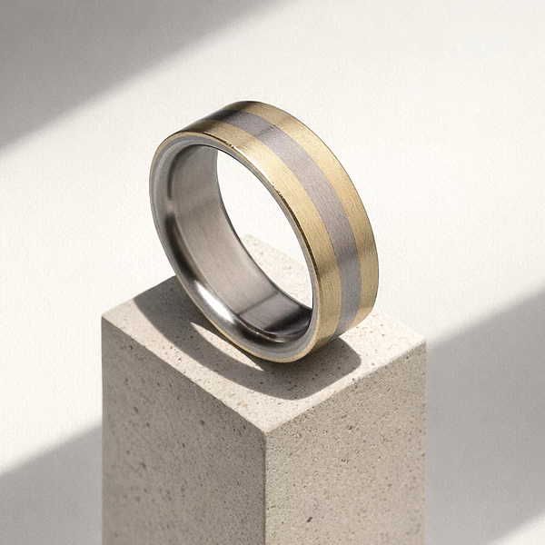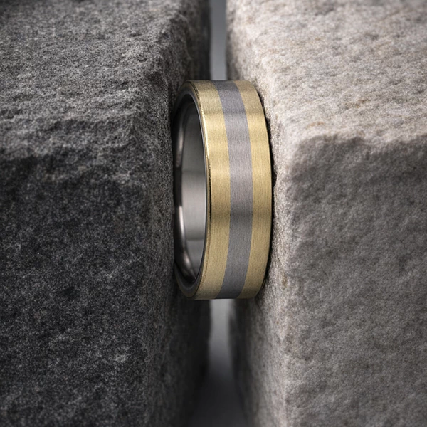 Obrączka z tytanu z dwoma paskami żółtego złota 14k łączy nowoczesną formę z czytelnym akcentem klasyki. Matowe wykończenie i płaski profil nadają jej spokojny, uporządkowany charakter, dobrze widoczny na dłoni.