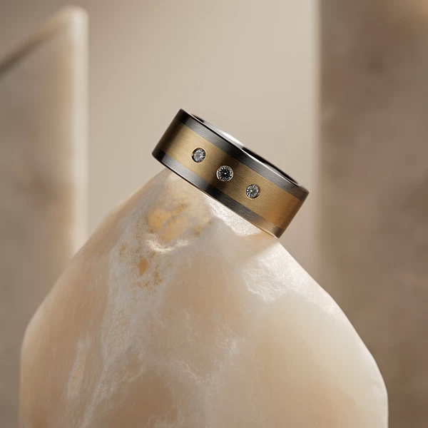 Mat wycisza powierzchnię i porządkuje szeroki format obrączki, dlatego całość wygląda spokojniej niż w pełnym połysku. Przez środek biegnie pas żółtego złota 14k, który wprowadza cieplejszy kolor i mocny kontrast wobec chłodnego tonu tytanu. W złocie osadzono trzy diamenty o łącznej masie 0,11 ct: centralny kamień 0,05 ct oraz dwa boczne po 0,03 ct. Symetryczne rozmieszczenie daje czytelny punkt skupienia, bez wrażenia nadmiaru. Płaski profil podkreśla proste linie i nowoczesny charakter, dlatego ten model dobrze prezentuje się na większych dłoniach albo tam, gdzie obrączka ma być wyraźnym elementem biżuterii.