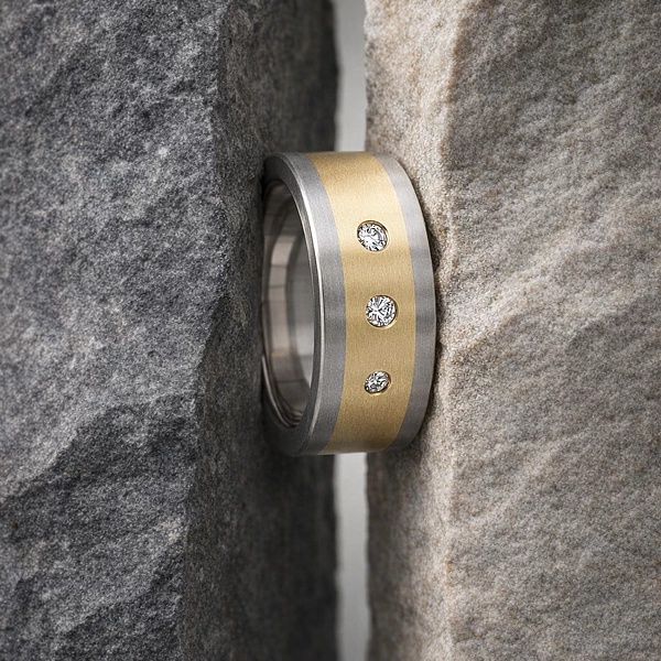 Obrączka z tytanu i żółtego złota z 3 diamentami 10 mm