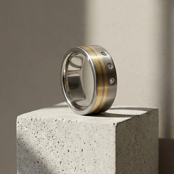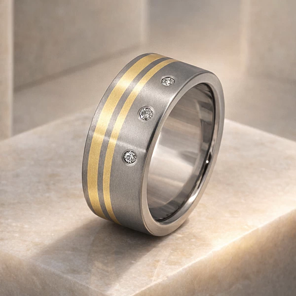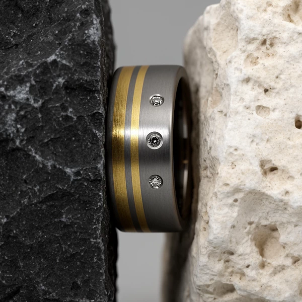 Wzdłuż jednej krawędzi biegną dwa wąskie paski z 14-karatowego złota. Ciepły ton złota ożywia chłodną szarość tytanu – kontrast jest czytelny, a zarazem wyważony. Po przeciwnej stronie osadzono trzy brylanty o łącznej masie 0,06 ct, barwie G i czystości VS/Si. Kamienie ułożone w rzędzie tworzą dyskretną linię światła. Nie przytłaczają formy, lecz dopełniają ją z umiarem. Całość łączy trzy materiały w jedną spójną kompozycję, zachowując przejrzystość projektu.