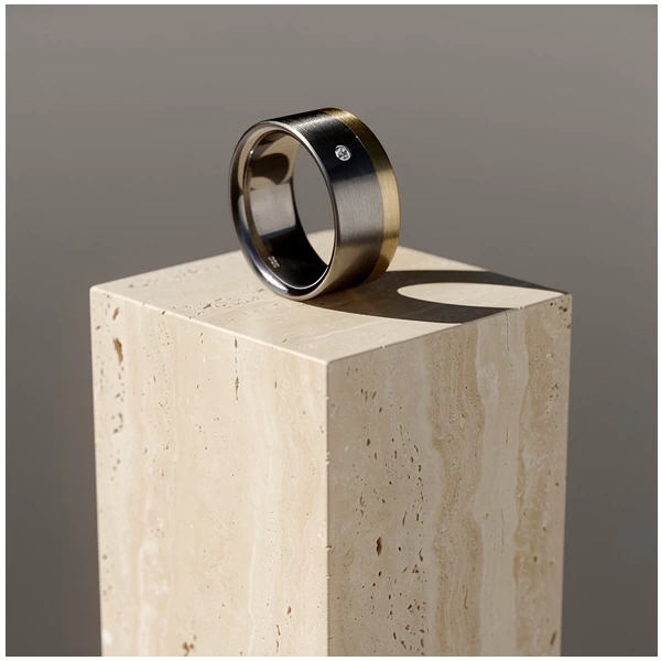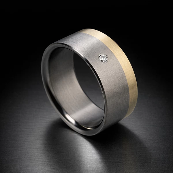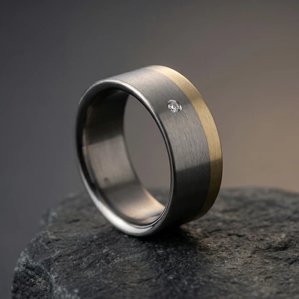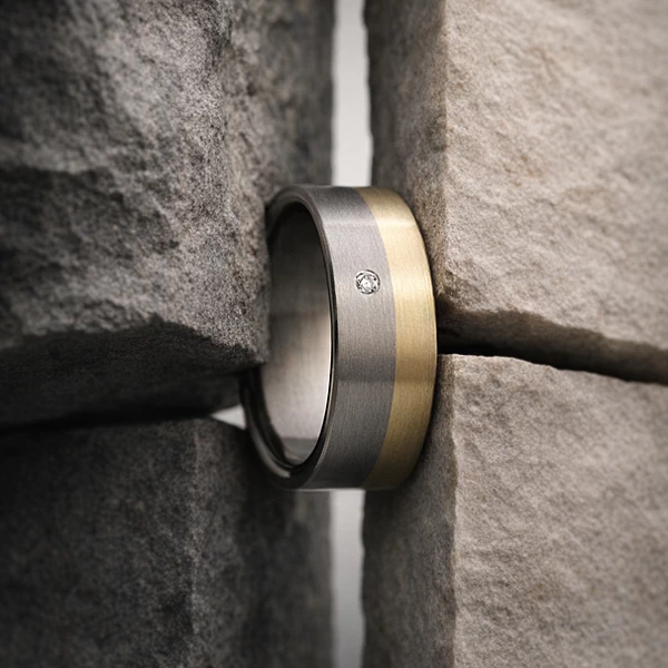 Ręczne wykonanie pozwala na precyzyjne dopracowanie każdego detalu, co widać w zestawieniu faktur i materiałów. Główna część obrączki posiada matowe wykończenie, nadające całości surowy, techniczny wygląd. Ten stonowany punkt wyjścia przełamano na obwodzie jednej z krawędzi cienkim paskiem z żółtego złota. Ciepły odcień szlachetnego kruszcu wyraźnie kontrastuje z chłodną szarością tytanu, wprowadzając klasyczny akcent do nowoczesnego projektu. Kompozycję uzupełnia starannie oprawiony w tytanowej części pojedynczy brylant o masie 0,03 karata. Kamień zapewnia subtelny punkt świetlny, który harmonizuje z minimalistyczną estetyką.