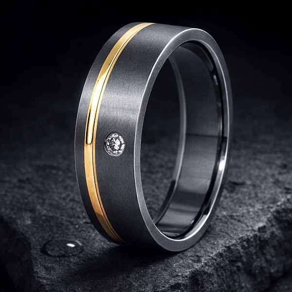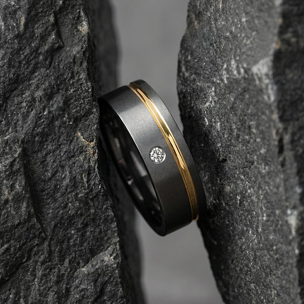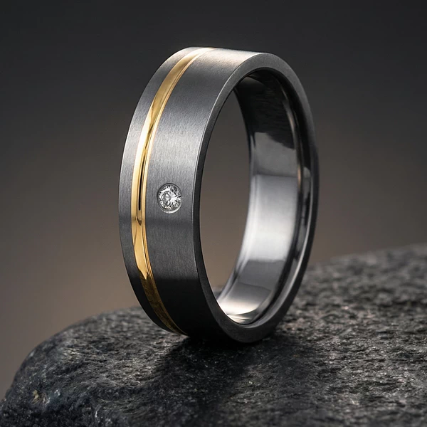Najmocniejszym elementem kompozycji jest rowek poprowadzony przy jednej krawędzi na całym obwodzie, wypełniony żółtym złotem. Taki układ wprowadza asymetrię, która ożywia prostą bryłę, ale nie odbiera jej czytelności. Ciepły kolor złota kontrastuje z chłodniejszym odcieniem tytanu, więc obrączka dobrze łączy nowoczesny materiał z bardziej klasycznym akcentem ślubnym. Osadzony w powierzchni tytanu diament 0,03 ct dodaje punktowego blasku. Przy tej wielkości kamień pozostaje subtelny, a jednocześnie wyraźniejszy niż bardzo drobne oprawy.