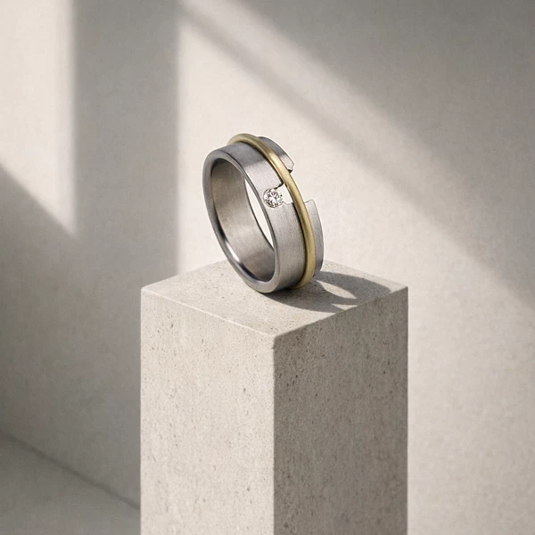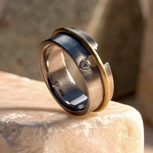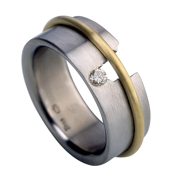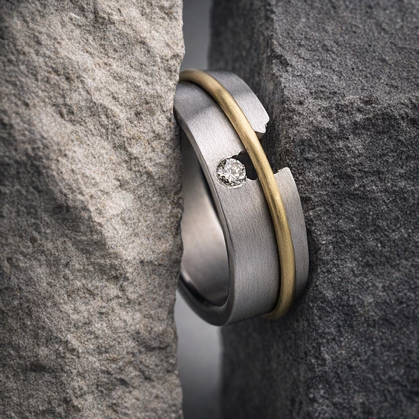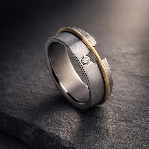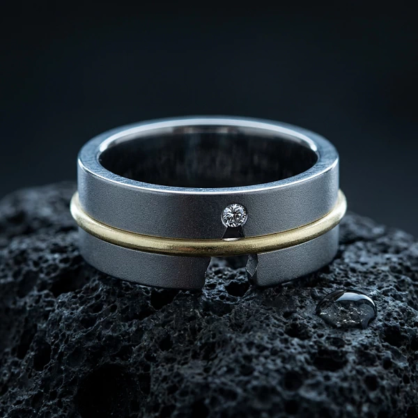 Wzdłuż jednej krawędzi biegnie pierścień z 14-karatowego żółtego złota o zaokrąglonym przekroju. Ciepły kolor złota kontrastuje z chłodną szarością tytanu, podkreślając podział obrączki na dwie strefy wizualne. Brylant 0,03 ct w jakości G-VS/Si osadzono w tytanowej części — jest dyskretny, widoczny głównie z bliska, nie zaburza równowagi formy.