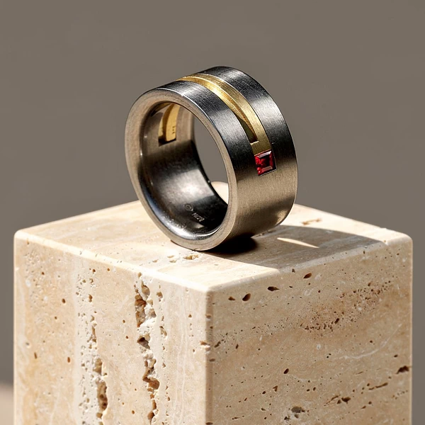 Projekt opiera się na wyrazistym zestawieniu matowego tytanu z pasmem czternastokaratowego żółtego złota. Ciepły akcent obejmuje dokładnie połowę obwodu, wprowadzając intrygujący balans wizualny. Na samej granicy obu materiałów osadzono naturalny rubin. Kwadratowy szlif fasetowy typu princess świetnie współgra z płaskim, linearnym kształtem obrączki. Ręczne wykonanie w pracowni rzemieślniczej pozwala na staranne dopracowanie krawędzi oraz głęboko matowej powierzchni. Struktura ta bardzo łagodnie pochłania światło, co mocniej eksponuje nasyconą barwę kamienia. Projekt można modyfikować, łącząc bazę z białym złotem lub srebrem. To praktyczne rozwiązanie, gdy jedna osoba w parze wybiera tytan, a druga woli inną kolorystykę, szukając spójności formy przy zachowaniu własnych upodobań.