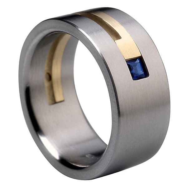 Na styku obu materiałów osadzono naturalny szafir o kwadratowym szlifie princess. Taki kamień wprowadza precyzyjny, uporządkowany detal i dobrze współgra z płaskim profilem obrączki. Umieszczenie go przy krawędzi złota i tytanu dodatkowo podkreśla linię podziału materiałów, dzięki czemu całość zyskuje bardziej dopracowany rytm.