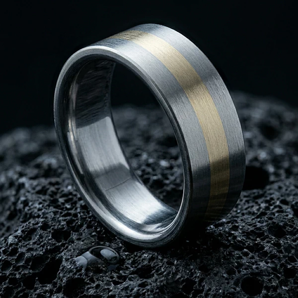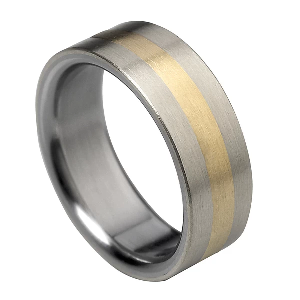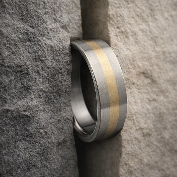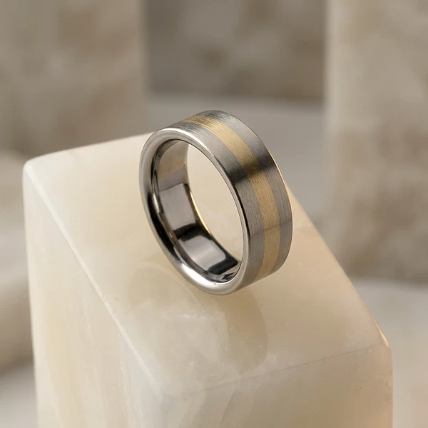 Obrączka o szerokości 7,5 mm, która łączy surowy charakter tytanu z klasycznym akcentem żółtego złota. Płaski profil i matowe wykończenie czynią ją dyskretnym, a zarazem solidnym dodatkiem, który sprawdza się w codziennym użytkowaniu.
