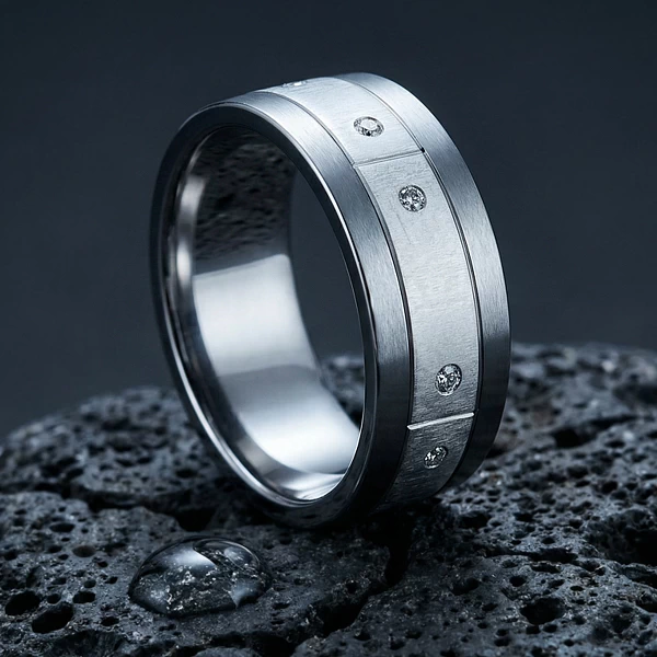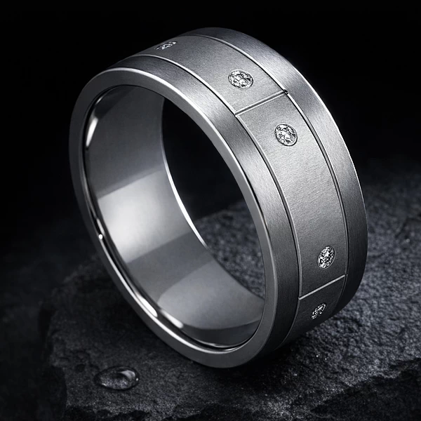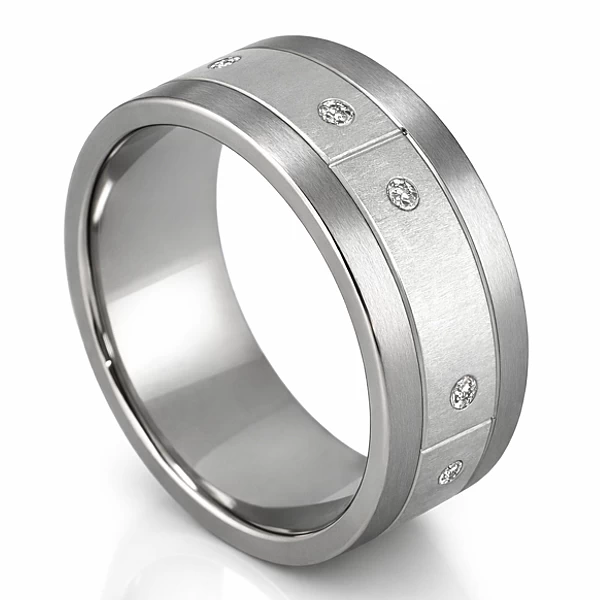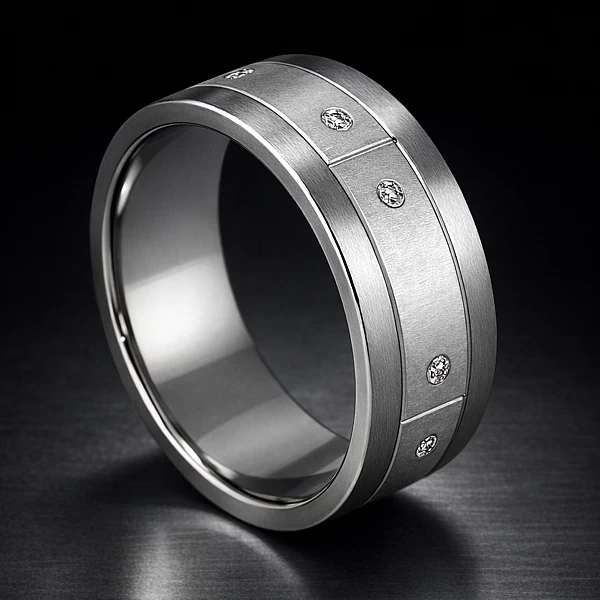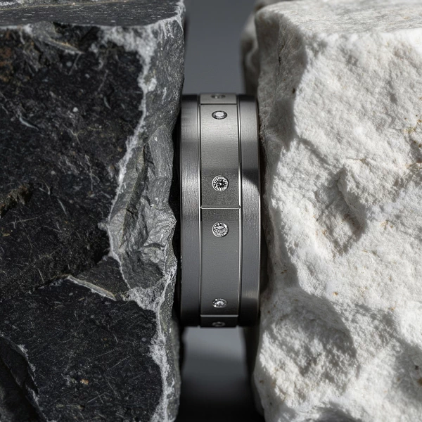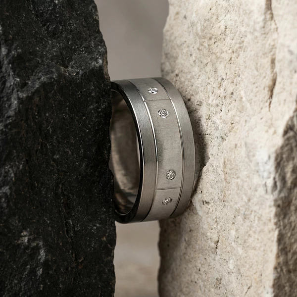 W tym modelu uwagę przyciąga kontrast między gładkim matem a piaskowaną częścią centralną. Industrialny motyw grawerowany w środku nadaje obrączce techniczny, bardziej współczesny charakter i porządkuje szeroką powierzchnię. Płaski profil wzmacnia ten efekt, bo zamiast miękkiej linii daje bardziej architektoniczny odbiór. Dziesięć diamentów o łącznej masie 0,20 ct zostało wkomponowanych tak, by rozjaśnić kompozycję bez odejścia od jej surowego stylu. Ich barwa G, czystość VS/SI i brylantowy szlif dają jasny, uporządkowany błysk, który dobrze pracuje z matowym tłem.