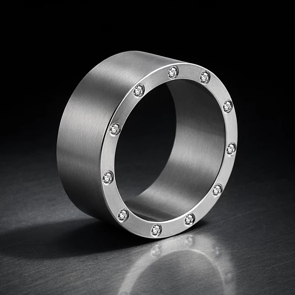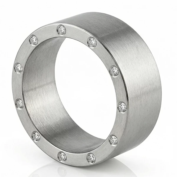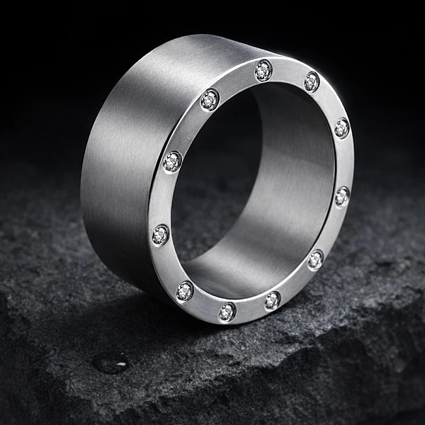 Matowa obrączka z tytanu o płaskim profilu ma wyrazistą, nowoczesną formę. Szerokość 10 mm i diamenty osadzone na rancie nadają jej mocną obecność na dłoni, ale bez ciężkiego charakteru.