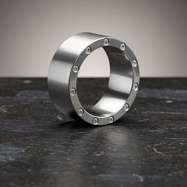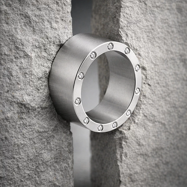 Ręczne wykonanie ma tu znaczenie w wykończeniu krawędzi, równomiernym prowadzeniu matu i precyzji osadzenia kamieni. W tytanie to właśnie dopracowanie powierzchni i proporcji decyduje o odbiorze obrączki. Warto też pamiętać, że ten materiał jest twardszy niż typowe stopy złota i mniej podatny na odkształcenia, choć jego klasyczna korekta rozmiaru bywa bardziej wymagająca.