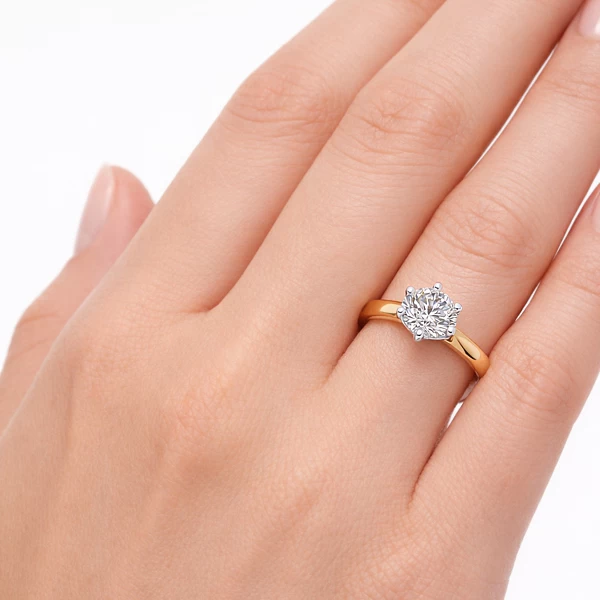 Pierścionek, w którym klasyczna szyna z ciepłego, żółtego złota 14-karatowego łączy się z nowoczesną koroną z białego złota - to kompozycja oparta na świadomym wyborze proporcji, barwy metalu i charakteru oprawy. Centralny diament o masie 0,70 karata, osadzony w sześcioramiennej oprawie, nie wymaga dodatkowych kamieni towarzyszących. Jego barwa G i czystość Si1 zapewniają wyraźny blask i przejrzystość przy naturalnym świetle, a szlif brylantowy wzmacnia optykę całości.