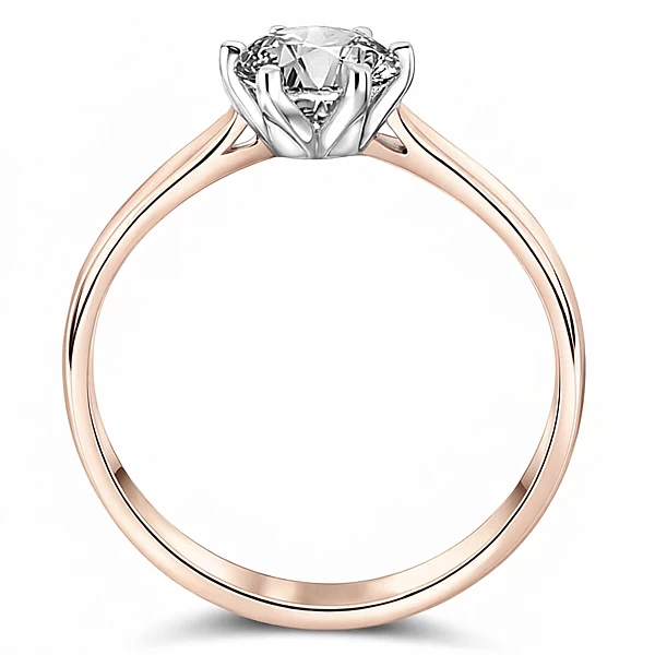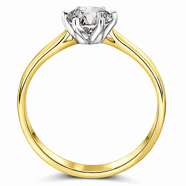 Oprawa sześcioramienna (tzw. „korona na sześć łapek”) ma znaczenie zarówno estetyczne, jak i praktyczne. Sześć symetrycznych ramion delikatnie otula brylant, formując klasyczną, ponadczasową kompozycję. Jednocześnie taka liczba łapek zwiększa stabilność kamienia i redukuje ryzyko jego obrócenia czy rozchwiania podczas wieloletniego noszenia. Gładko wykończona szyna z żółtego złota zapewnia komfort także przy częstym zakładaniu i zdejmowaniu pierścionka.