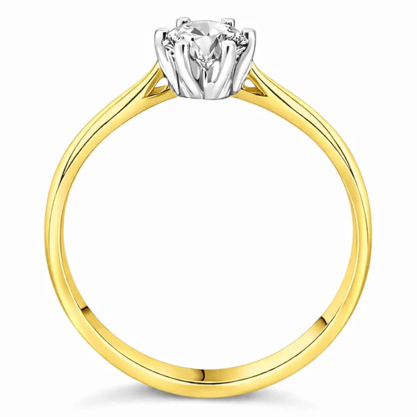 Ten klasyczny model łączy tradycję sztuki jubilerskiej z przemyślaną konstrukcją, zaprojektowaną tak, aby maksymalnie wyeksponować naturalny blask kamienia. Szyna wykonana z żółtego złota ociepla projekt i świetnie komponuje się z odcieniem skóry, podczas gdy sześcioramienna korona z białego złota płynnie przechodzi w oprawę diamentu. Takie rozwiązanie nie jest przypadkowe – jasny metal w bezpośrednim sąsiedztwie brylantu potęguje jego świetlistość i sprawia, że front pierścionka wydaje się optycznie większy. To projekt, w którym estetyka spotyka się z funkcjonalnością, tworząc formę idealnie sprawdzającą się podczas zaręczyn i codziennego użytkowania przez długie lata.