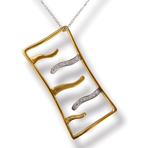 Ta złota zawieszka to prawdziwa perła w świecie jubilerskich propozycji. Wyróżnia się spośród nich zarówno rozmiarem, jak też oryginalnym projektem. Mariaż białego oraz żółtego złota urzeka pięknem i szlachetnością. Niezwykłego charakteru dodało zawieszce 9 drogocennych kamieni – to diamenty, które przy każdym ruchu uroczo połyskują. Ta geometryczna wariacja zachwyca prostotą formy oraz doskonałą jakością wykonania. Będzie wspaniałym prezentem dla kobiety cieniącej oryginalną biżuterię z nutą klasycznej elegancji.