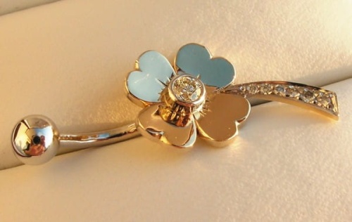 Kolczyk przedstawia symbolizującą szczęście czterolistną koniczynę wykonaną z żółtego złota. Zapięcie kolczyka zakończone wkręcaną kulką, wykonane jest z białego złota. W środku koniczyny oprawiono duży brylant, a na łodydze wykonanej z białego złota umieszczono 6 mniejszych brylantów.
